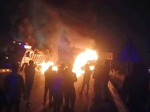 आरंग में एक सड़क हादसे में ट्रक ड्राइवर जिंदा जल गया। तड़के सुबह 4 बजे कोयले से भरी ट्रेलर ने जिप्शम से भरी ट्रक को पीछे से टक्कर मार दी। टक्कर के बाद दोनों गाड़ियों में भीषण आग गई और ड्राइवर की दर्दनाक मौत हो गई। आरंग के पारागांव नेशनल हाईवे 53 में यह घटना हुई। सूचना मिलते ही आरंग पुलिस ने मौके पर पहुंचकर आग को बुझाया गया, लेकिन तब तक कोयले के भरे ट्रेलर चालक की जलकर दर्दनाक मौत हो गई थी। पुलिस के मुताबिक जिप्शम से भरे ट्रक का टायर फटने से ड्राइवर और खलासी दोनों नीचे उतरे थे, तभी पीछे से कोयले से भरे ट्रेलर ने टक्कर मार दी। मृतक ट्रेलर चालक की अभी तक शिनाख्त नहीं हो पाई है। पुलिस मामले की जांच कर रही है।