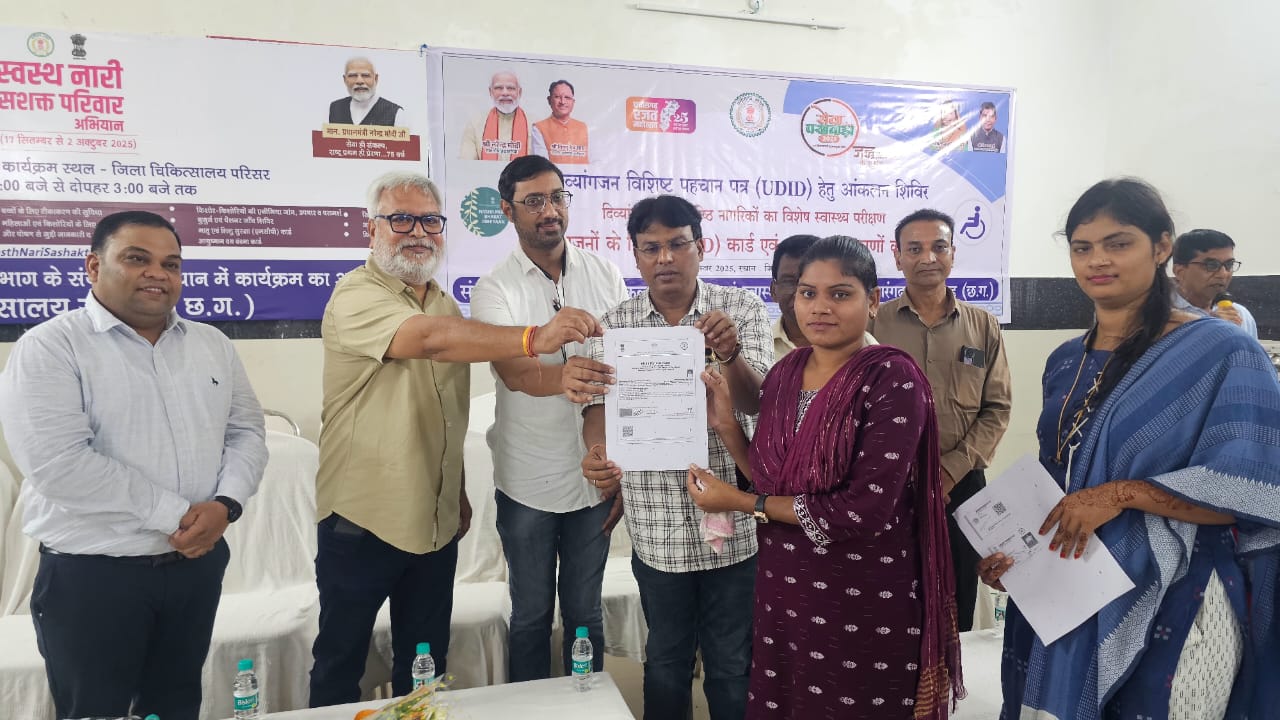 सारंगढ़ बिलाईगढ़, /सेवा पखवाड़ा के अवसर पर समाज कल्याण विभाग एवं स्वास्थ्य विभाग द्वारा संयुक्त रूप से स्वास्थ्य परीक्षण, दिव्यांगजनों के लिए विशिष्ट पहचान पत्र बनाने के साथ यूडीआईडी कार्ड एवं वितरण आयोजन जिला चिकित्सालय सारंगढ़ में किया गया। शिविर में नगरपालिका परिषद सारंगढ़ के पार्षद मयूरेश केशरवानी, गणमान्य नागरिक अरविंद हरिप्रिया, उप संचालक समाज कल्याण विनय तिवारी, सिविल सर्जन डॉ दीपक जायसवाल, डॉ आर एल सिदार, डीपीएम नंदलाल इजारदार, मेडिकल बोर्ड की टीम, स्पेशल एजुकेटर खीरमती पटेल, नीलम लकड़ा सहित अधिकारी कर्मचारी मौजूद रहे। कार्यक्रम का संचालन आर बी तिवारी ने किया। इस अवसर पर 5 दिव्यांगजनों को विशिष्ट पहचान पत्र प्रदाय किया गया।