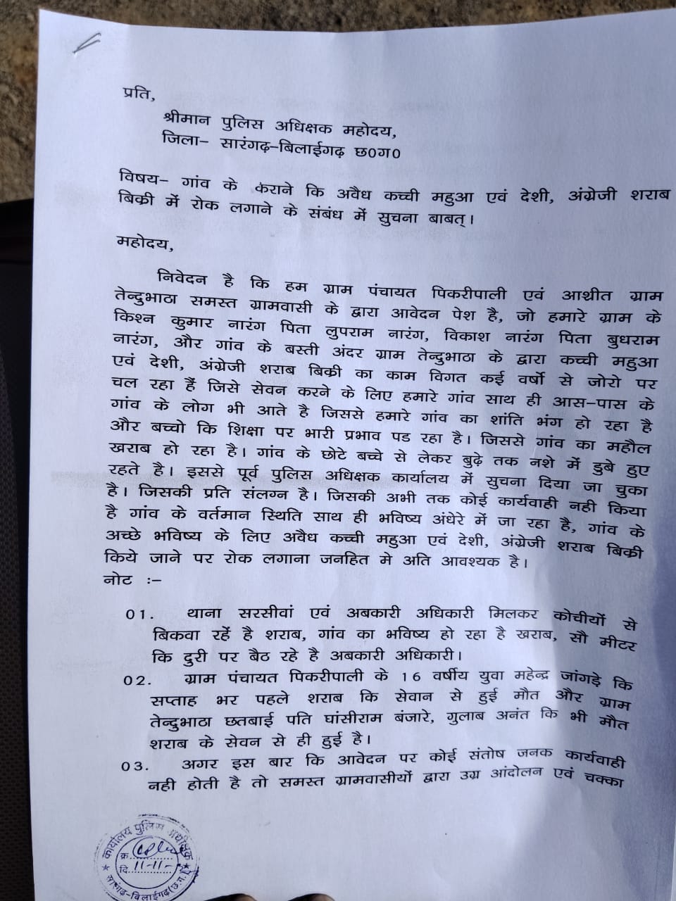 गांव में अवैध शराब बिक्री पर रोक लगाने की मांग — ग्रामीणों ने पुलिस अधीक्षक को सौंपी शिकायत
