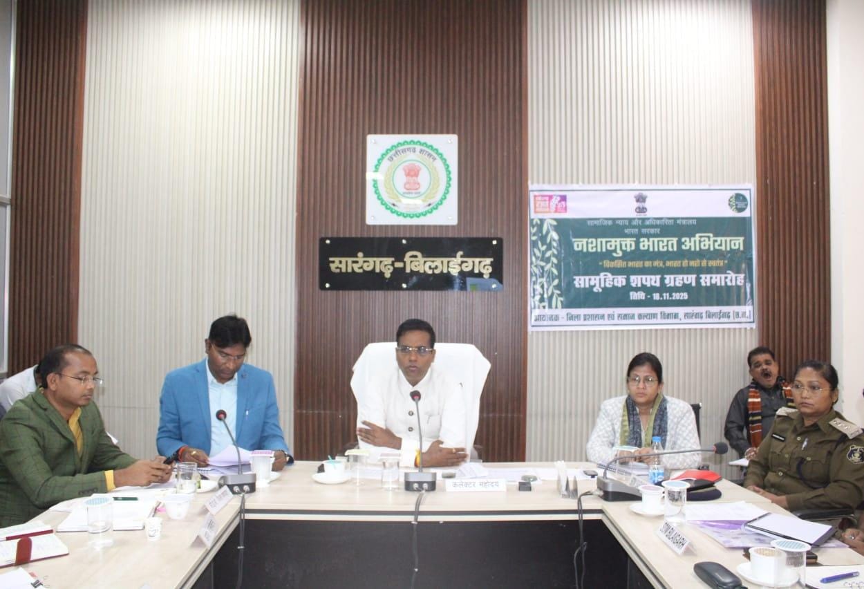 सुव्यवस्थित हो, यह सभी अधिकारी मिलकर अपना दायित्व अनुसार सुनिश्चित करें। बैठक में सभी ने नशा मुक्ति का शपथ लिया। कलेक्टर ने आयुष्मान कार्ड और आयुष्मान वय वंदना कार्ड की धीमी प्रगति पर नाराजगी व्यक्त करते हुए कहा कि, बुजुर्गो का लिस्ट लेकर उनके आसपास गांव में शिविर कर उन्हें बुलायें और उनका कार्ड बनाकर 100 प्रतिशत कार्य पूर्ण करें। आयुष्मान कार्ड कार्य में सभी अधिकारी एसडीएम, बीएमओ, आरएचओ डॉक्टर को भी कलेक्टर ने ध्यान देने के लिए कहा। डॉ कन्नौजे ने शिक्षा विभाग के अधिकारी कर्मचारी को अपार आईडी कार्य में तेजी लाने के निर्देश दिए। बैठक में पिछले दिनों में अच्छा कार्य करने के लिए ई जिला प्रबंधक ईडीएम गंगाधर विश्वकर्मा, खाद्य अधिकारी गणेश कुर्रे, महिला एवं बाल विकास अधिकारी वृजेंद्र ठाकुर, सोशल मीडिया समन्वयक सोनू साहू को प्रशस्ति पत्र प्रदान किया गया।बैठक में जिले के अधिकारीगण उपस्थित थे