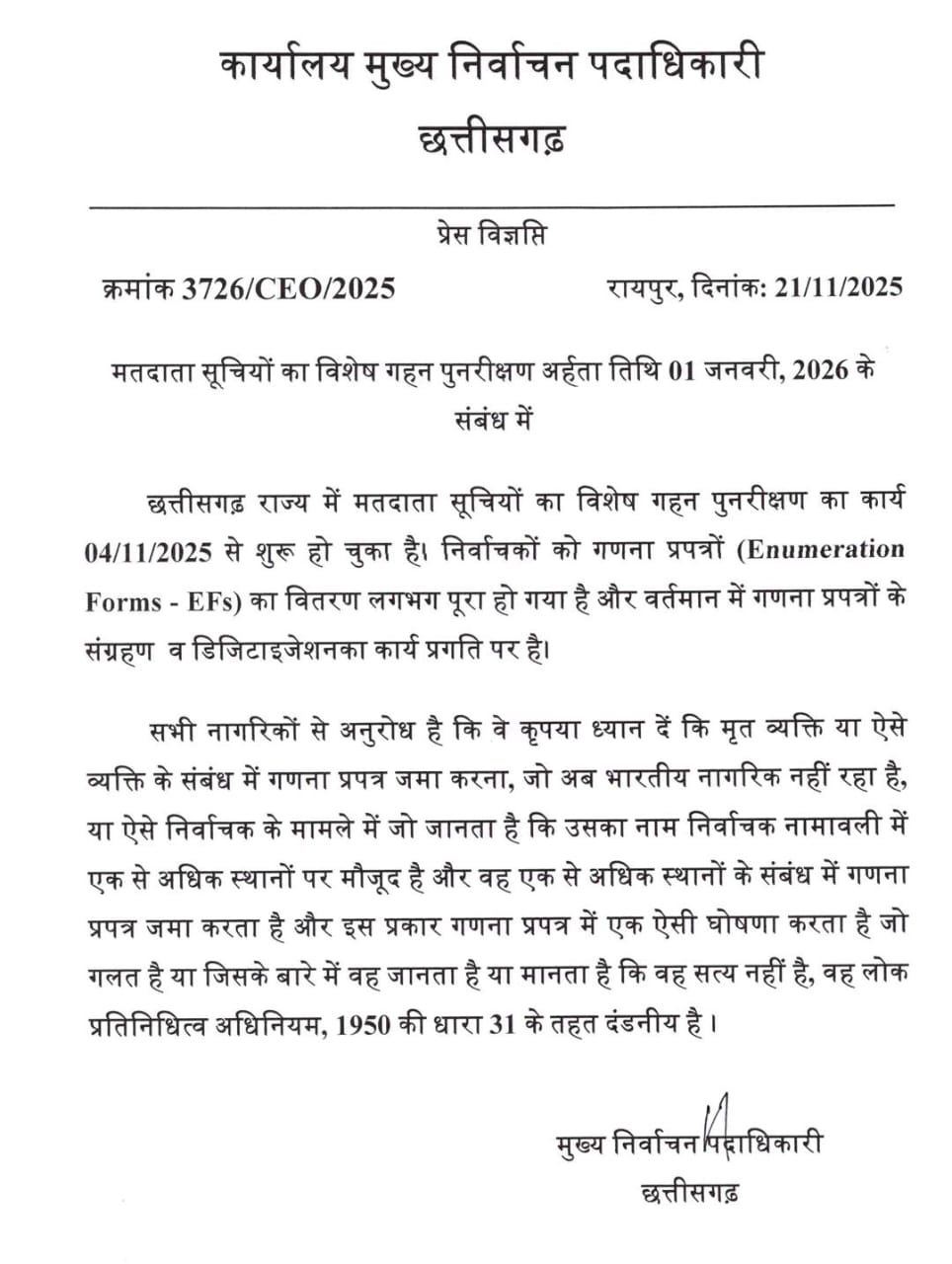 मुख्य निर्वाचन पदाधिकारी छत्तीसगढ़ ने सभी नागरिकों से अनुरोध किया है कि वे कृपया गंभीरता से ध्यान दें,”मृत व्यक्ति या ऐसे व्यक्ति के संबंध में गणना प्रपत्र जमा करना, जो अब भारतीय नागरिक नहीं रहा है, या ऐसे निर्वाचक के मामले में जो जानता है कि उसका नाम निर्वाचक नामावली में एक से अधिक स्थानों पर मौजूद है और वह एक से अधिक स्थानों के संबंध में गणना प्रपत्र जमा करता है और इस प्रकार गणना प्रपत्र में एक ऐसी घोषणा करता है जो गलत है या जिसके बारे में वह जानता है या मानता है कि वह सत्य नहीं है, वह लोक प्रतिनिधित्व अधिनियम, 1950 की धारा 31 के तहत दंडनीय है।”