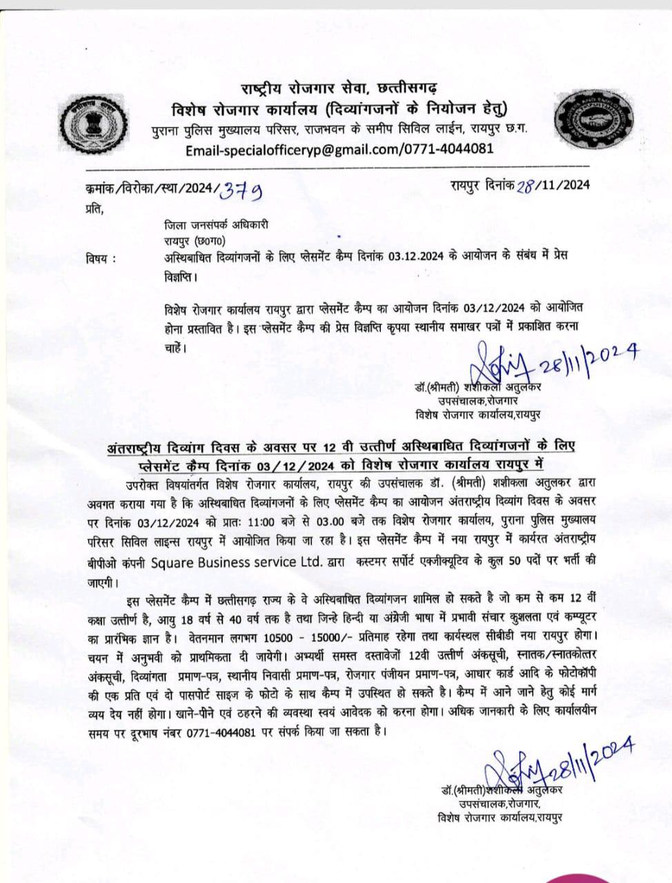12वी उत्तीर्ण अस्थिबाधित दिव्यांगजनों के लिए 3 दिसंबर को रायपुर में प्लेसमेंट कैम्प