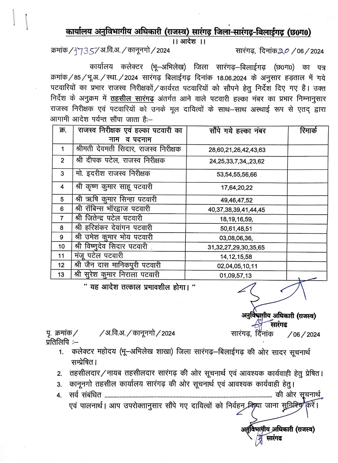 सारंगढ़ तहसील के प्रभारी आरआई और पटवारियों के मोबाइल नंबर जारी