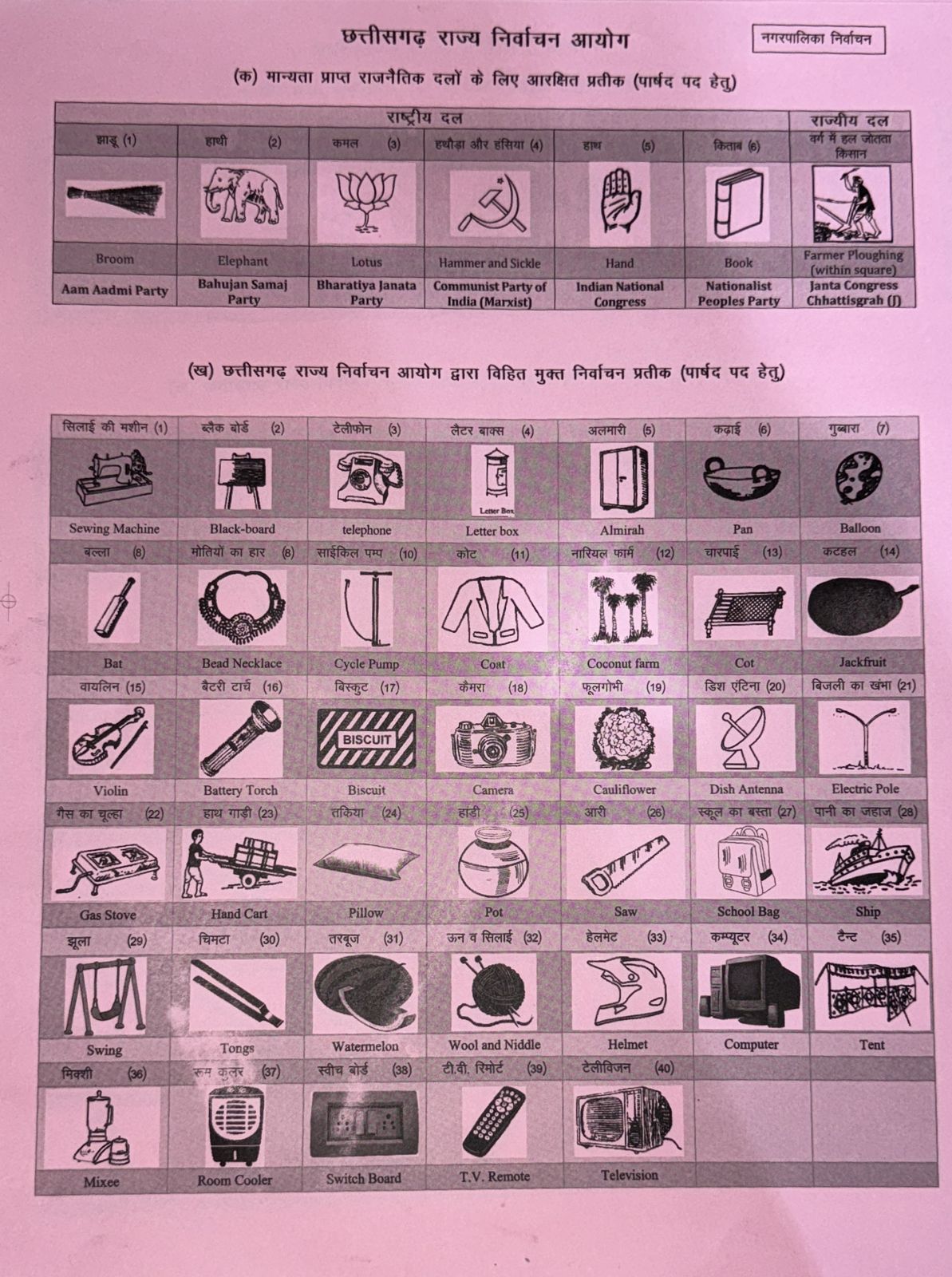 *नगरपालिक निगम में महापौर, नगरपालिका और नगर पंचायत में अध्यक्ष पद हेतु प्रतीक चिन्ह*: इसके अंतर्गत स्लेट, कांच का गिलास, ट्यूब लाईट, स्टूल, रोड रोलर, सीटी, प्रेशर कुकर, गले की टाई, बेन्च, अंगूठी, गैस सिलेण्डर, हारमोनियम, डीजल पम्प, चक्की, मेज, सेव, केतली, फ्राक, बाल्टी, द्वार घंटी, कुआ, ऑटो-रिक्शा, फलों से युक्त टोकरी, एअरकंडीस्नर, केक, चिमनी, हीरा, बांसुरी, अंगूर, माइक, मटर, सोफा, भाला फेंक, ट्रक, टायर, छडी, बटुआ, खिडकी, ईंट, बेल्ट, केल्कूलेटर, कारपेट, शतरंज बोर्ड, लैपटॉप, कैरम बोर्ड, आईसक्रीम, पेट्रोल पम्प, रेफ्रीजरेटर, रूम हीटर, सीसीटीवी कैमरा का मुक्त प्रतीक चिन्ह शामिल है।