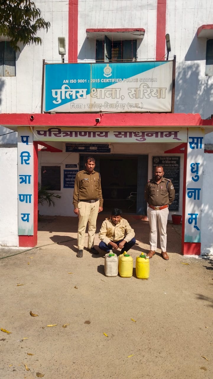 सारंगढ,बिलाईगढ़,,,सरीया । दिनांक 27 जनवरी 25 को मुखबीर की सुचना पर घटना स्थल ग्राम बोंदा खार पंडरी तालाब पिहरा रोड के पास जाकर अवैध महुआ शराब ब्रिकी की सुचना पर दबिश दिया गया । आरोपी हृदय कुमार डनसेना पिता प्रहलाद डनसेना उम्र 37 वर्ष साकिन पिहरा थाना सरिया जिला सारंगढ़ छग के कब्जा से उसके पेश करने पर तीन अलग-अलग सफेद रंग के प्लास्टिक जरीकेन में रखा अवैध हाथ भठ्ठी का बना कच्ची महुआ शराब करीबन 60 लीटर को गवाहों के समक्ष जप्त कर कब्जा पुलिस में लिया गया।आरोपी हृदय कुमार डनसेना के विरूद्ध थाना सरिया में अक 17/2025 धारा 34(2), 59 (क) आबकारी एक्ट कायम कर मामला विवेचना में लिया आरोपी को विधिवत् गिरफ्तार किया गया है, प्रक. के गिरफ्तार आरोपी को न्यायिक रिमाण्ड पर भेजा गया है। इस प्रकार थाना क्षेत्र में अवैध शराब बिकी करने वालों के विरूद्ध सरिया पुलिस लगातार कार्यवाही जारी कर रही है। कार्यवाही में थाना सरिया के थाना प्रभारी सउनि० टीकाराम खटकर के नेतृत्व में सउनि सुमन कुमार चौहान, सउनि सावित्री कोराम,प्र०आर० सुरेंद्र सिदार, आरक्षक दिलीप स्नेही, राजकुमार साव का सराहनीय योगदान रहा।